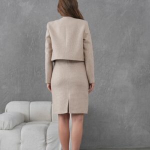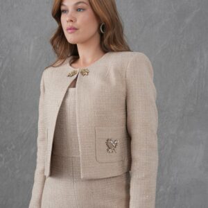 Горниот дел е кратко, елегантно сако со кружен изрез и два украсни метални брошеви што додаваат раскошен, женствен акцент.