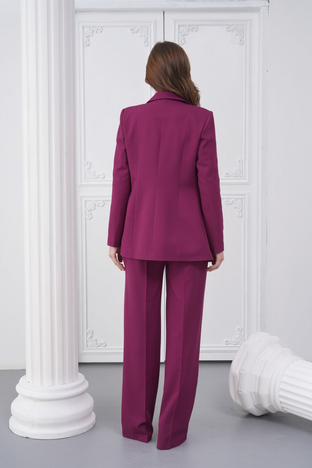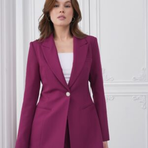 Сакото, со должина од 70 cm и целосна постава, има класичен крој со нагласена половина и едно копче напред, што создава чиста, издолжена силуета. Панталоните, со должина од 110 cm, се со прав крој што обезбедува префинет и структуриран изглед, идеален за секојдневни и свечени комбинации.