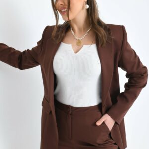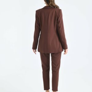 Овој елегантен женски костим е составен од структурирано сако и класични панталони, изработени од квалитетна ткаенина со состав 64% полиестер, 34% вискоза и 2% ликра. Сакото е со должина од 70 cm, целосно подшивано, со изчистена линија, еден копче и практични предни џебови со капачиња. Панталоните со должина од 95 cm имаат прав крој што визуелно издолжува силуета и овозможува удобно носење во текот на целиот ден.