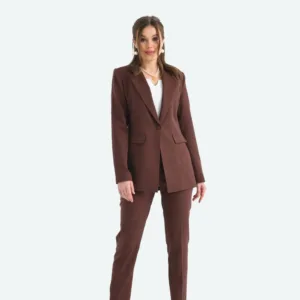 Овој елегантен женски костим е составен од структурирано сако и класични панталони, изработени од квалитетна ткаенина со состав 64% полиестер, 34% вискоза и 2% ликра. Сакото е со должина од 70 cm, целосно подшивано, со изчистена линија, еден копче и практични предни џебови со капачиња. Панталоните со должина од 95 cm имаат прав крој што визуелно издолжува силуета и овозможува удобно носење во текот на целиот ден.