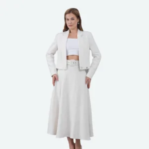 Елегантен женски костим со долга суќна и сако – бела боја