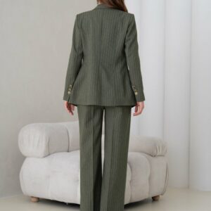 Софистициран и модерен, овој сет е совршен избор за жени кои сакаат класичен изглед со современ допир. Темно зелената нијанса внесува длабочина, елеганција и префинетост, додека издолжениот крој на сакото и широките панталони создаваат балансирана и современа силуета. Идеален за канцеларија, деловни состаноци, но и за свечени прилики.