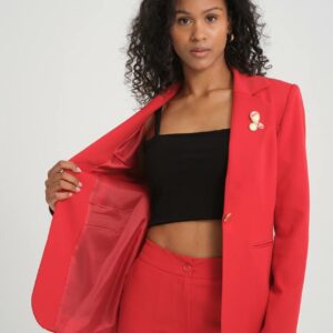 Смел и софистициран, овој сет е вистински избор за жени кои сакаат да остават впечаток. Интензивната црвена нијанса внесува енергија и самодоверба, додека класичниот крој создава елегантна и издолжена силуета. Совршен за канцеларија, важни деловни средби, но и за свечени пригоди кога сакаш да блеснеш.