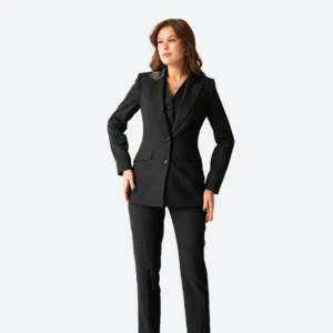 Безвременска елеганција во модерен крој – овој црн сет е вистински избор за жени кои сакаат да изгледаат професионално, стилски и софистицирано. Долгото струкирано сако со прецизна линија и елегантните панталони создаваат комплет кој носи моќ и самодоверба. Совршен за деловни средби, свечени настани или како модна основа за елегантен секојдневен изглед.
