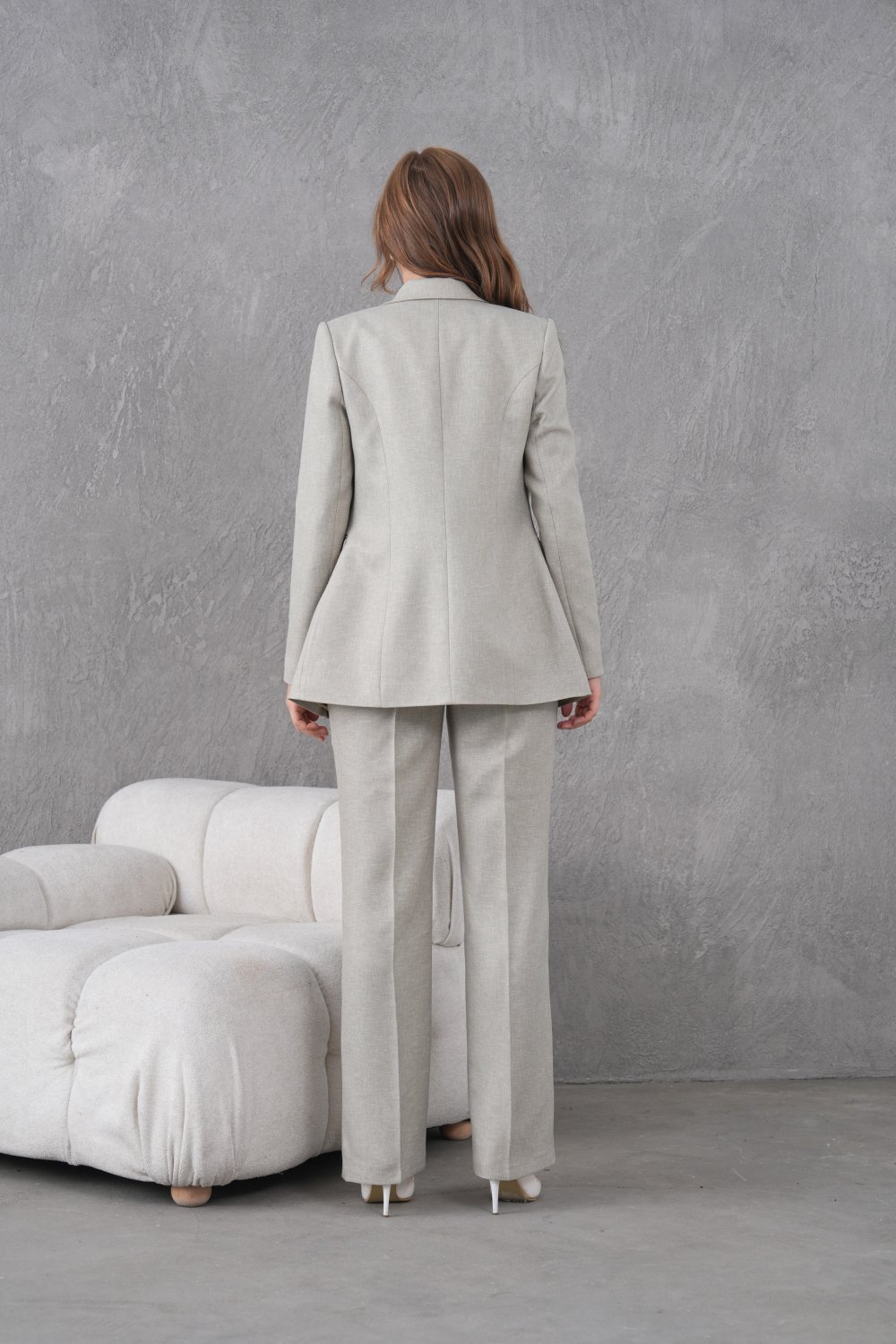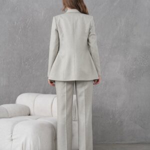 Овој елегантен сет претставува совршен спој на класичен дизајн и современа софистицираност. Светлосивата нијанса внесува свежина и префинет изглед, додека прецизниот крој ја истакнува силуетата и обезбедува професионален и уреден стил. Идеален избор за деловни средби, канцелариски изглед и свечени пригоди.