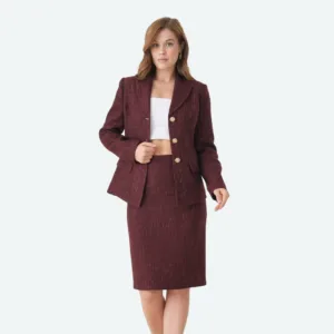 Овој софистициран комплет комбинира класична елеганција и модерен минимализам, создавајќи извонреден изглед за деловни средби, свечени настани или формални пригоди. Винската нијанса внесува топлина и луксуз, додека суптилната текстура на материјалот додава длабочина и стил.