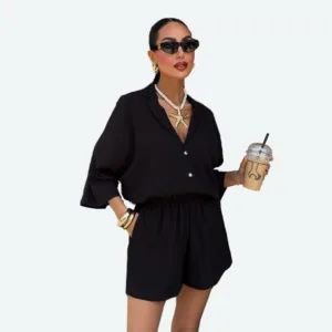 Овој стилски комплет од кошула и шорц во црна боја е дефиниција за едноставна елеганција. Изработен од лесен и дишечки лен, овој модел нуди удобност дури и во најтоплите денови. Кошулата има опуштен крој со копчиња по целата должина и џеб на градите, додека шорцевите се со еластичен појас за максимална удобност.