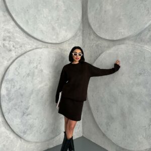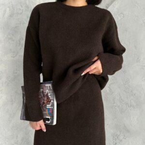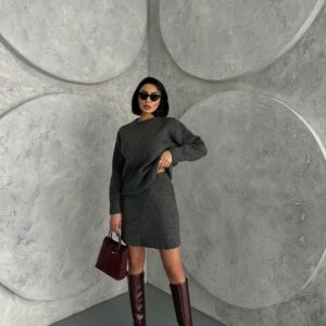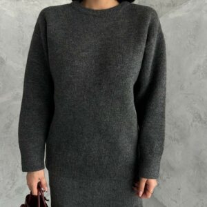 Се работи за сив плетен фустан со едноставен и елегантен дизајн, со долги ракави и кружен изрез на вратот. Материјалот е пријатен и мек, што го прави идеален за секојдневно носење или поважни прилики. Долниот дел е изработен како мини-фустан, кој додава модерна нота на класичниот стил.