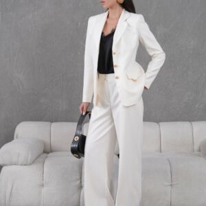 Овој женски костим е модерен, софистициран и идеален за деловни и свечени пригоди. Дизајнот комбинира структуриранo сако и панталони со широк крој, создавајќи елегантна и издолжена силуета.