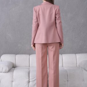 Овој женски костим е модерен, софистициран и идеален за деловни и свечени пригоди. Дизајнот комбинира структуриранo сако и панталони со широк крој, создавајќи елегантна и издолжена силуета.