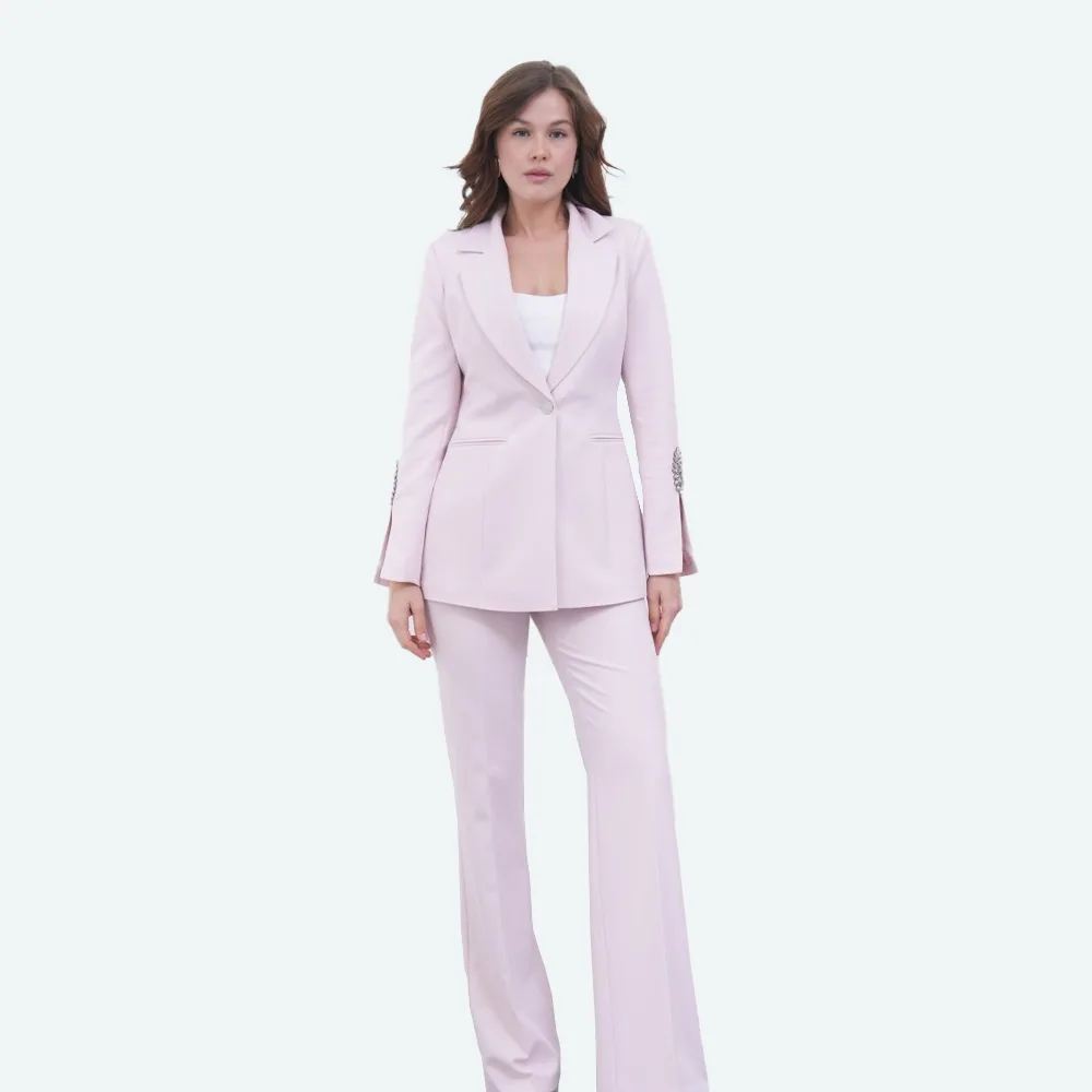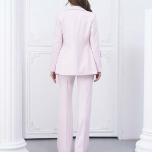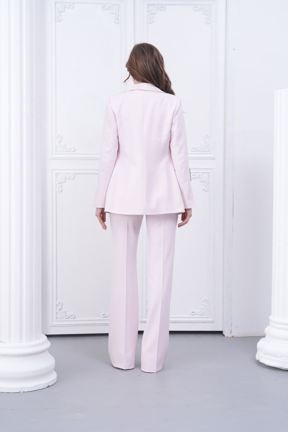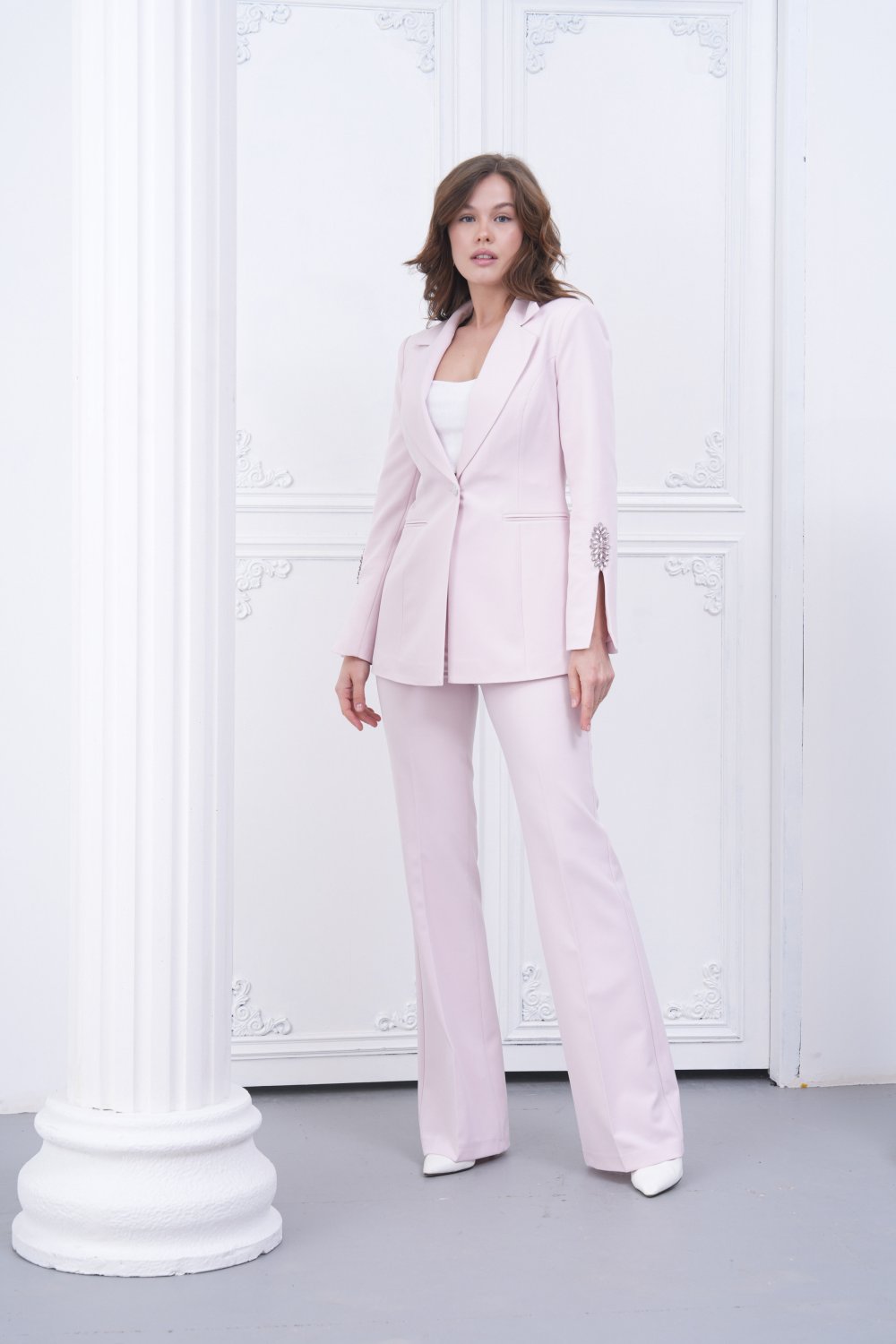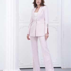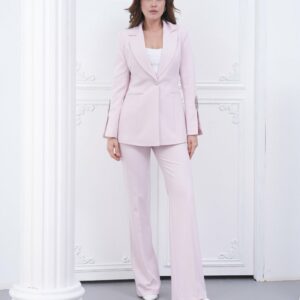 Светло розевата боја го нагласува класичниот и безвременски изглед на костумот, додека кројот и додатоците додаваат модерен допир. Ова е совршен избор за жени кои сакаат да изгледаат шик и елегантно, без компромис во удобноста.