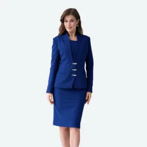 Сакото е украсено со четири декоративни метални копчиња на предниот дел, што му дава модерен и софистициран изглед. Има минималистички V-изрез, а ракавите се долги за дополнителна елеганција. Фустанот е едноставен и префинет, совршено вклопен со сакото.