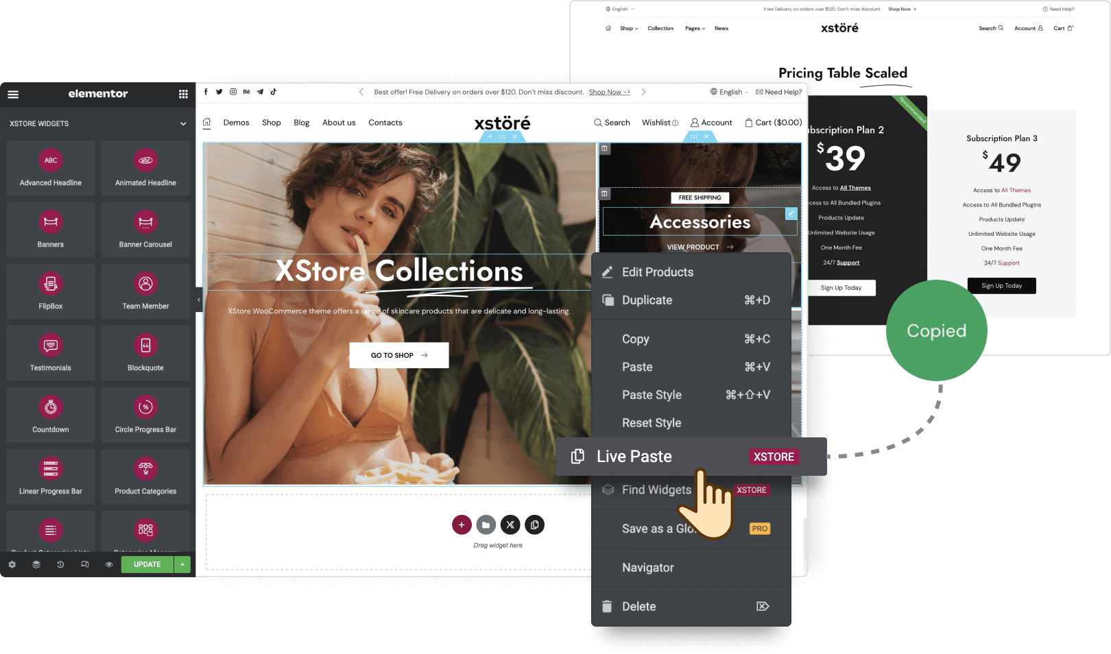 Go to XStore Elements page and click “Live Copy”. After that use ”Live Paste” on your site while editing page via Elementor.